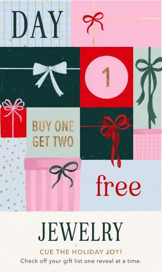 This is a limited time offer valid only through 12/03/25 on francescas.com, in boutiques and in outlets. Must buy one regular price item to get two items of equal or lesser value free. The discount only applies to select jewelry. Offer cannot be applied to gift cards, shipping, or prior purchases. Team members excluded. Francesca's policy and other terms may apply.